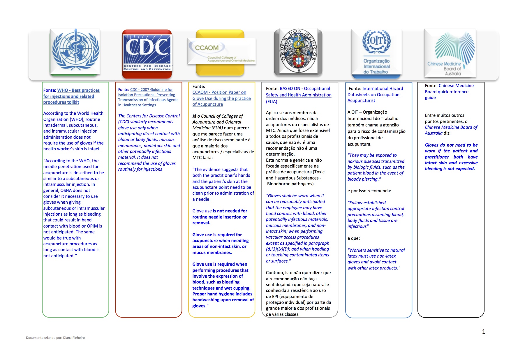 Após consulta de várias fontes nacionais e internacionais, pode-se concluir que: no exercício da Acupunctura, o risco de contaminação é baixo mais não é zero. O uso de luvas não é obrigatório, sendo o uso de luvas altamente recomendado nos casos em que se verifique se antecipe o extravasamento de sangue, e sempre quando, quer no profissional, quer no paciente haja afeções dermatológicas, feridas ou doenças infecto-contagiosas transmitidas e/ou desenvolvidas por via cutânea.